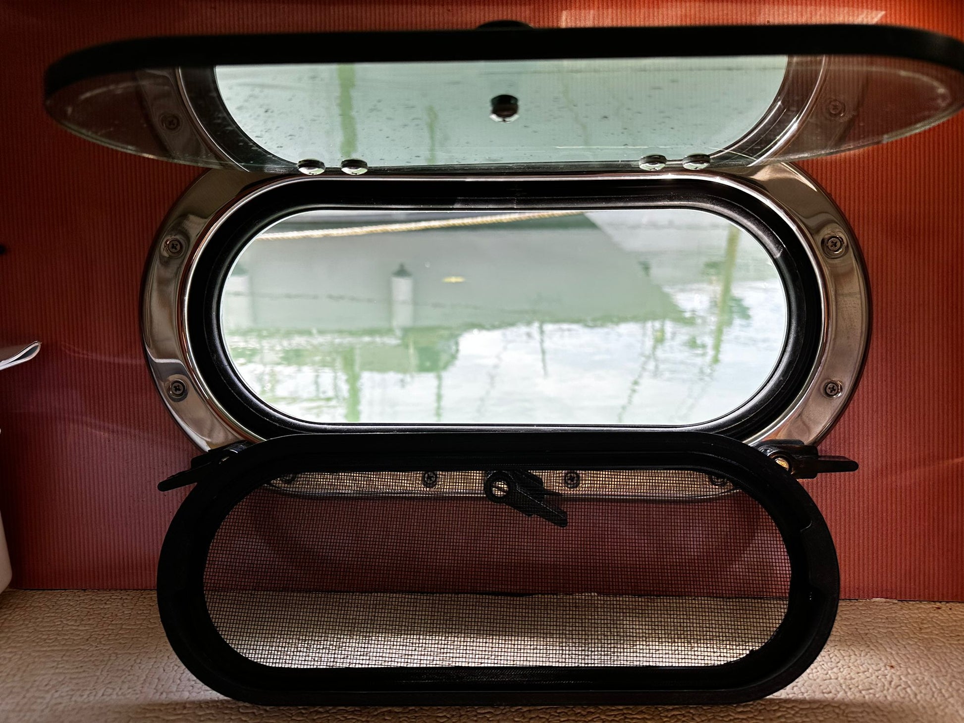Zanzariere progettate e realizzate completamente da noi, montabili su oblò SCM Ovali, in questo caso sono state montate su AIRON MARINE 345